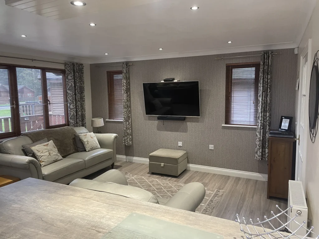 Amazing Lodge in the beautiful grounds of Bridlington golf and leisure park. Modern, well equipped with open plan living. It has 2 bedrooms and 2 bathrooms the main bedroom boasts a en-suite and smart TV. Secure decking area enables you to sit out and take in the beautiful surroundings. Only a short walk to Sewerby Hall grounds ,which you have free access to. The beach is only 400m away and Bridlington is a 30 minute walk along the stunning coastline.